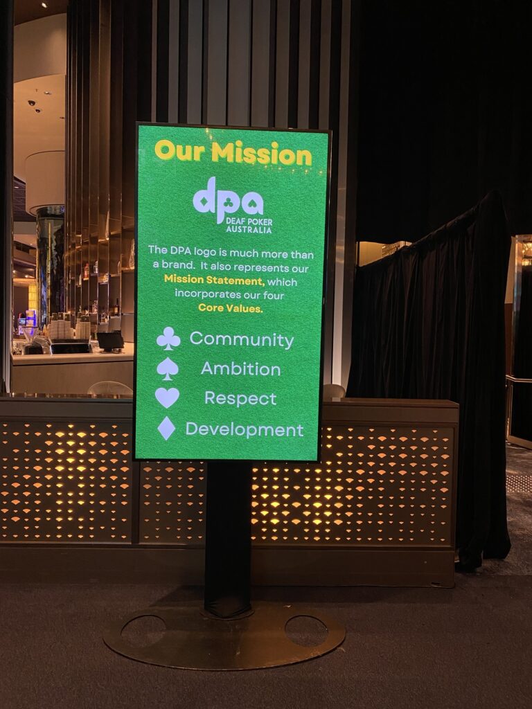 Founded in 2008, Deaf Poker Australia (DPA) is a volunteer-driven, non-profit organisation with a common interest in developing and promoting poker catering specifically to Deaf and Hard-of-Hearing (HOH) players.  As the game’s de facto governing body in the Australian Deaf community, DPA regularly collaborates with Deaf poker organisations in New South Wales, Queensland, South Australia, Western Australia and Victoria.